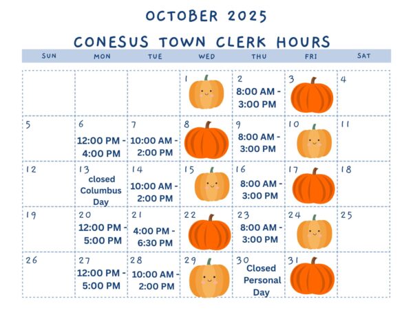 Town Clerk Hours Town Clerk Hours for October 2025 October 14, 2025 Written by Town Clerk Continue reading